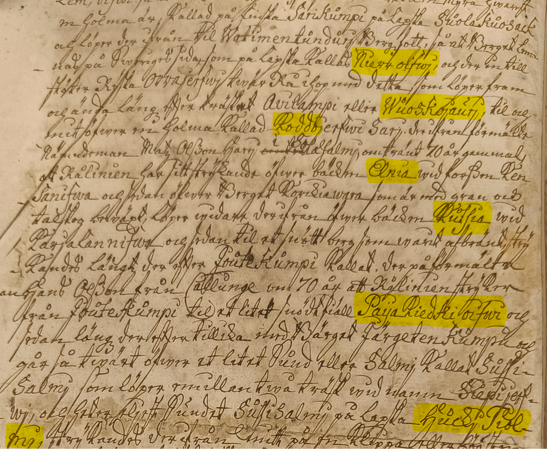 Kuolajärvensaamea, saamelaisia paikannimiä ja nimenosia esiintyy käräjäasiakirjoissa runsaasti vielä tämänkin jälkeen kuolajärveläistilojen katselmus- ja jakoasiakirjoissa (esim. 1767 "Njauckajerfwi" < kuolajärvens. *njāʰkkė ~ *njǡʰkkė 'made', myöh. Vuosnajärven Naakajärvi (vieressä tunturi Naakoiva, 1907 "Naakioivi"), 1779 "Ruåptåkånelån njemi" < *ruoʰp̄ṭȯ 'takaperoinen' (vrt. pohjoissaamen ruovttugoatnil 'konelo, missä vesi kulkee takaisinpäin'), niemi Tenniöjoen varrella, 1802 "Tjåckajärwi" < *čȯʰkkė ~ *čȯʰkkâ 'laki, huippu'", myöh. Sokkajärvi Vuosnajärven itäpuolella).