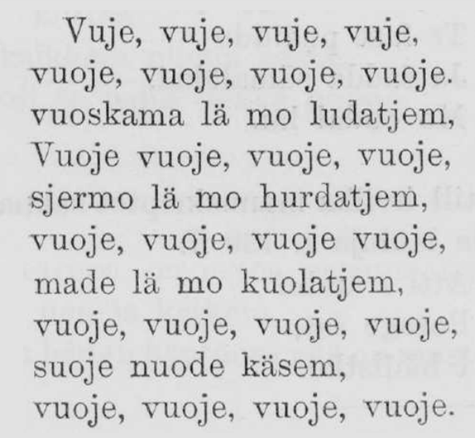 Kielen myöhäisestä olemassaolosta kertoo myös Ylikurtin Ollilan talossa 1900-luvulla muistettu 3-säkeinen saamenkielinen kehtolaulu, jonka kirjailija Paavo Hautala kirjoitti talteen 1960- tai 1970-luvulla. Laulu löytyy Hautalan kirjasta Tuntsan kojamot.